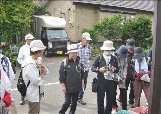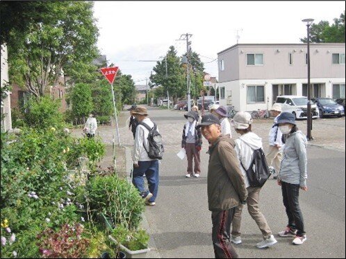 集合後軽い体操をして、北町内と西町内の庭のきれいな場所を捜し歩きました。