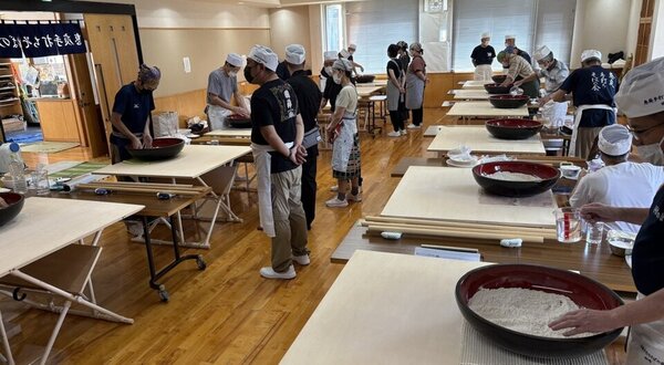 試食配膳の裏方です。食事できる人数を把握し、そばをゆで、洗い、盛り付け、試食の部屋に配膳していきます。