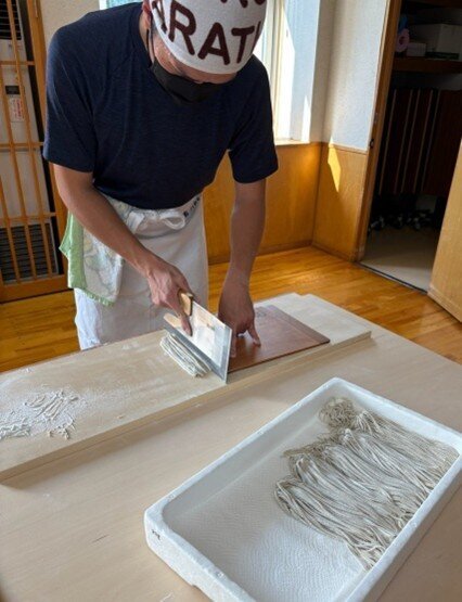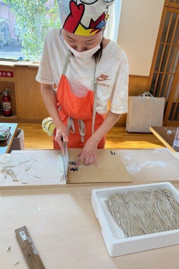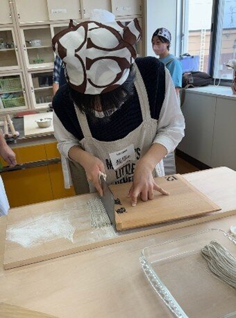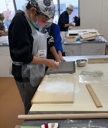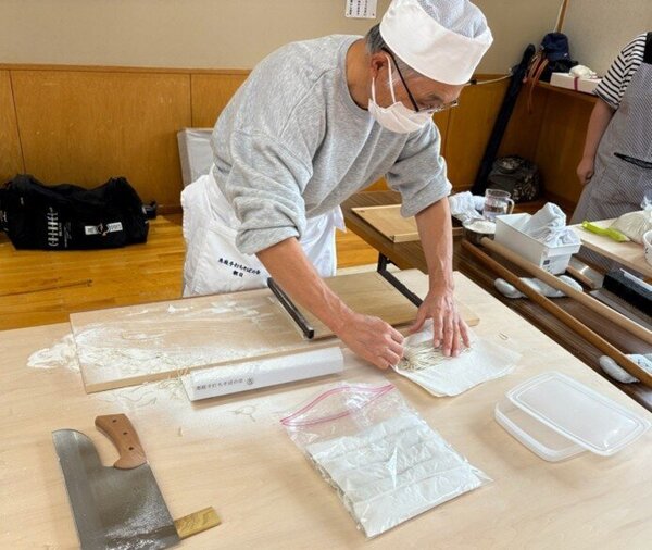「のし」~「切り」はそばの外観を決める工程になります。一本一本、丁寧に切ることで、のどごしの良い、おいしいそばになります。この工程でも、才能を発揮されている方が多くいらっしゃいました。