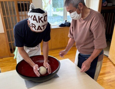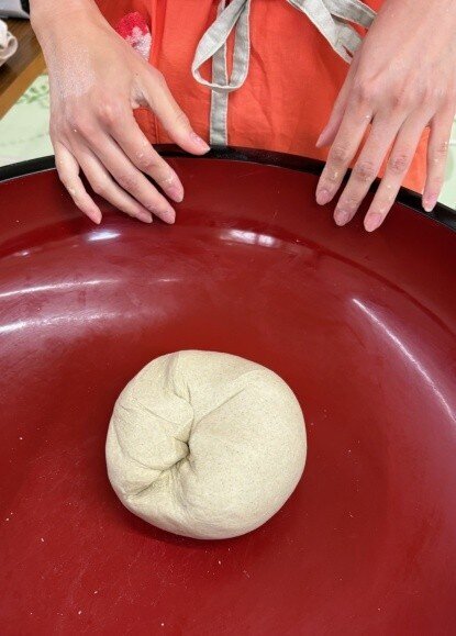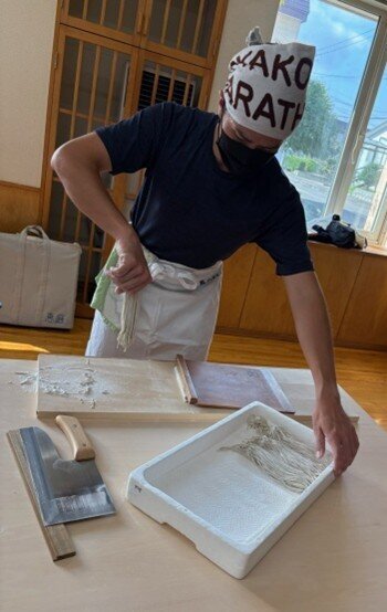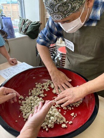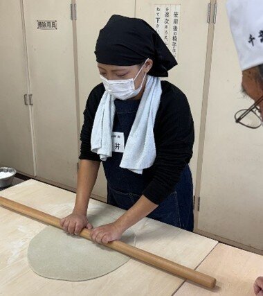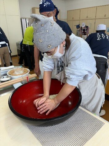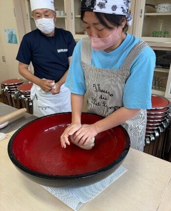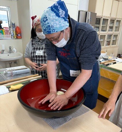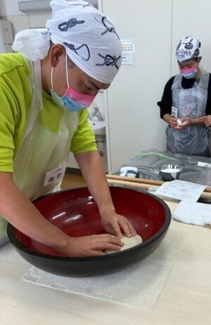 「水回し」から「こね」は、そばを打つ中で最重要な工程です。そばの出来を左右する部分で、受講者は真剣に取り組みました。