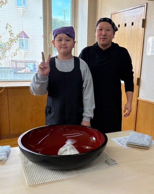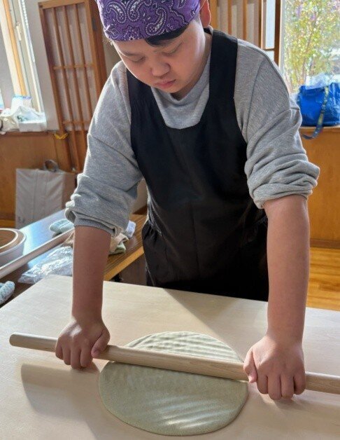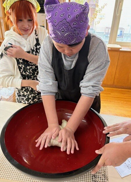 10月25日(土)練習会② いくみ会館 参加11名+体験1組 体験にいらしたタカハシ様ご家族です。息子さん、最初は「恐る恐る」でしたが、次第に慣れてきて、楽しそうにそば打ちしていました。