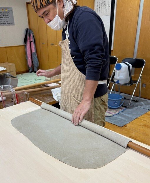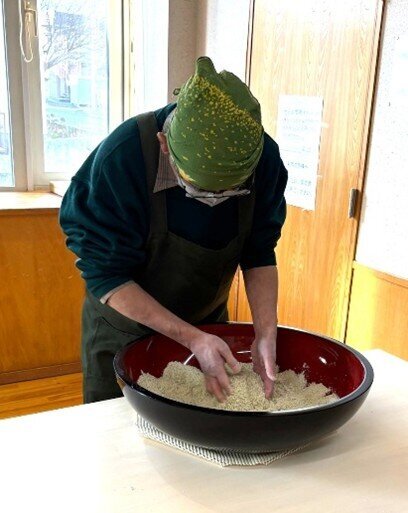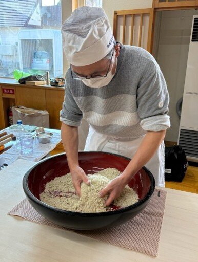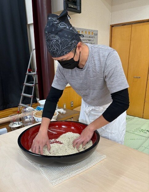 K田さん、四段位受験前最後の練習会です。本番まであと少し。ひたすらそば粉に向かい合います。