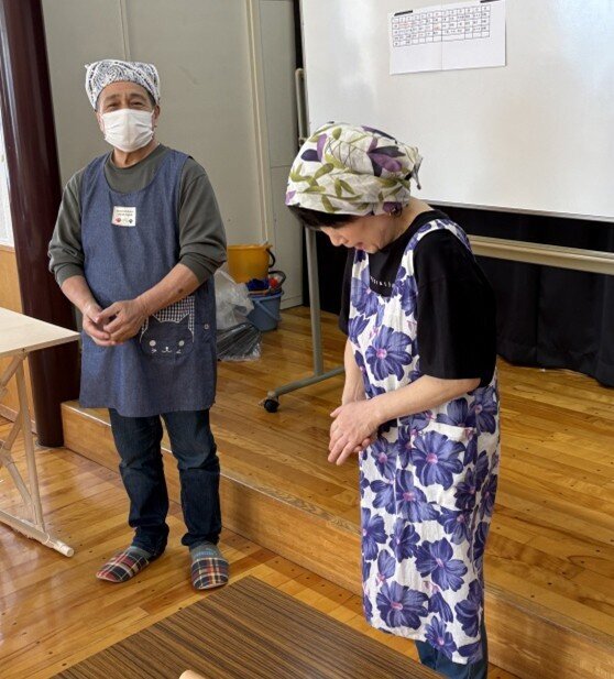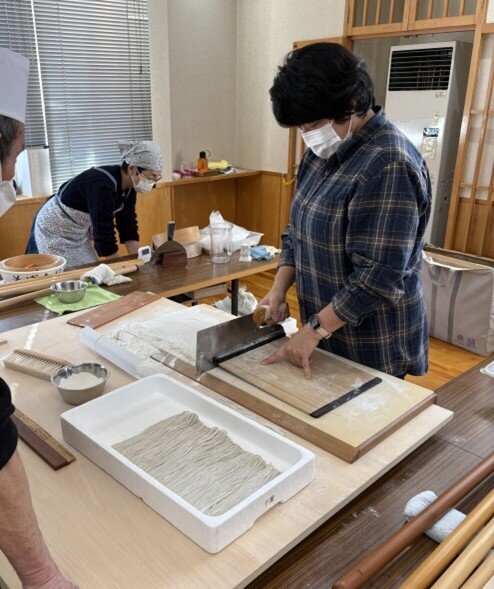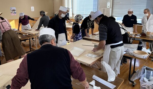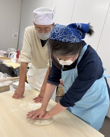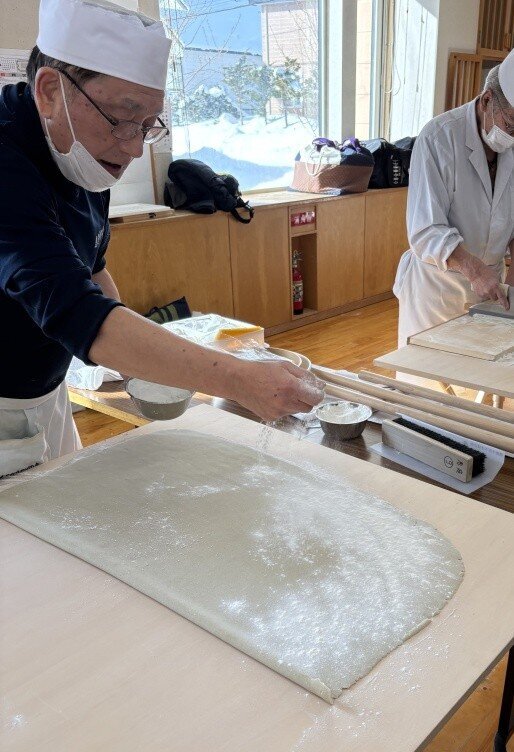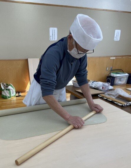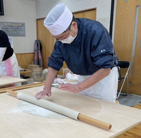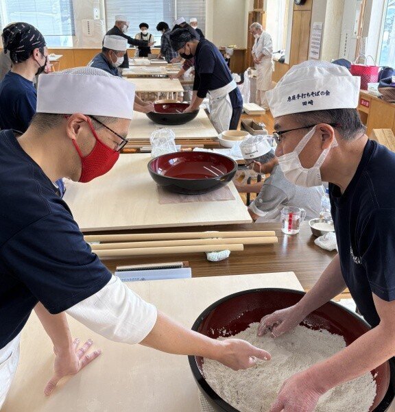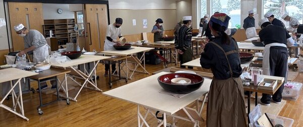 そば打ちだけで22名の参加者がありました。12台のそば打ち台が2巡で足りなくなる(試食打ちもあるため)状況は、コロナ禍ぶりです。今回は、1巡目に上段位の打ち手を配し、2巡目の参加者は研修する、2巡目は1巡目の打ち手が指導する、という体制を取りました。